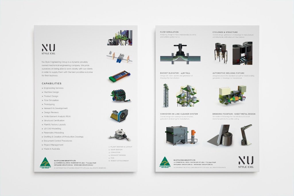 Freelance work for NU Style Eng. Group included editing exsisting flyers and adding to their library using their branding as well as setting up files for another round of business card printing using clear toner over the logo.
